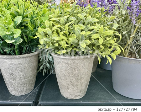 artificial flowers in a pot on a shelf in a store. High quality photo