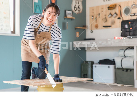 家のガレージでノコギリで木を切るアジア人女性(DIY教室・ワークショップ・日曜大工・体験教室)