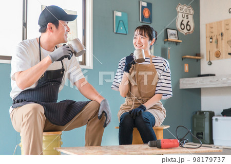 ガレージでコーヒーを飲むアジア人男女(DIY教室・ワークショップ・日曜大工・体験教室)