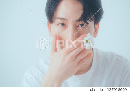 花と若い男性 — ナチュラルでアンニュイな雰囲気のビューティカット