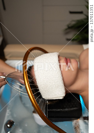 Client relaxing during a wellness head spa with water treatment and scalp massage for hair care in a beauty salon
