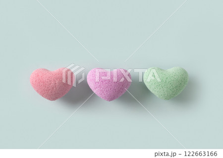 Valentine's Day three heart shaped bath salt on pastel blue background. View from above. Love concept.