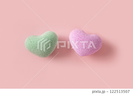 Valentine's Day heart shaped bathtub salt on pastel pink background. View from above. Space for your greetings. Love concept.