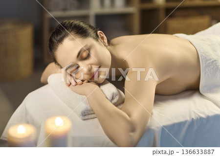 Relaxed woman on spa massage table with candles in serene wellness setting