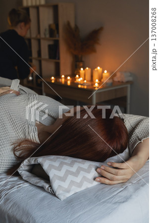 Spa client relaxing on massage table with burning candles and soft bokeh