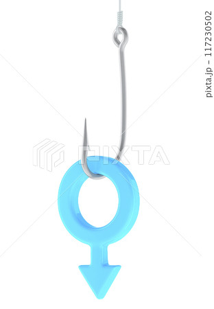 Fishing hook with blue male gender symbol, 3D rendering