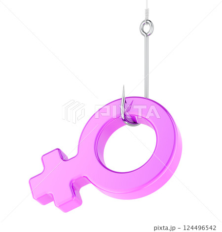 Pink female gender symbol on the fishing hook, 3D rendering