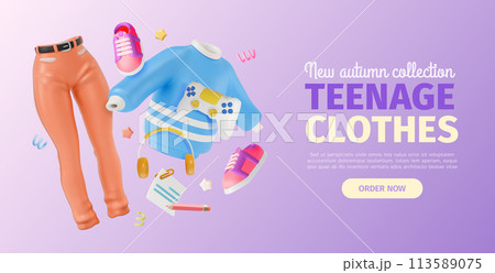 3d New Autumn Teenage Clothing Collection Ads Banner Concept Poster Card. Vector illustration of Floating Sweater, Jeans and Shoes Pair