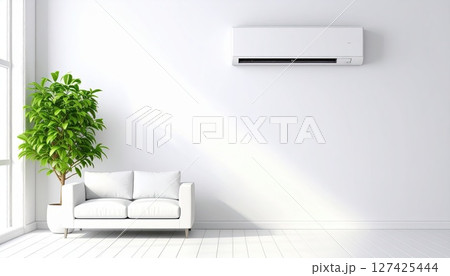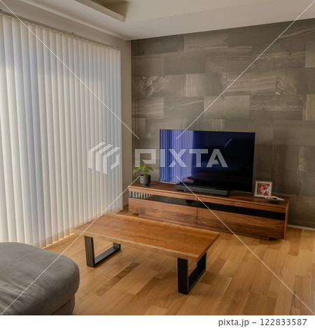 グレーのソファと空白のフレームが飾られたモダンミニマルなリビングルーム