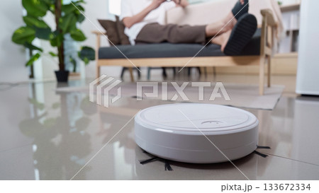 Home Automation. Robotic vacuum cleaner cleaning floor while user relaxes on couch.
