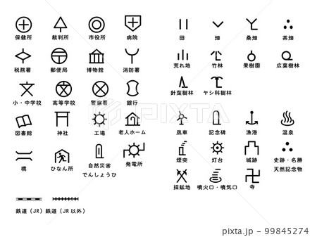 シンプルな地図に使われる地図記号のイラストセット、アイコン、ピクトグラム、マーク