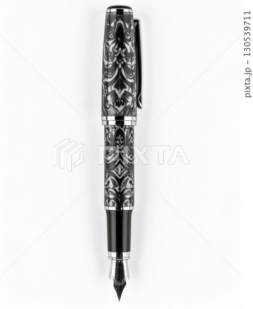 Decorative Fountain Pen with Silver Floral Pattern on White Background