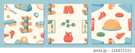 Flat seamless pattern with sport and gym equipment set. Fitness and workout items in set style. Athlete healthy training background for exercise, lifestyle, decoration purposes.