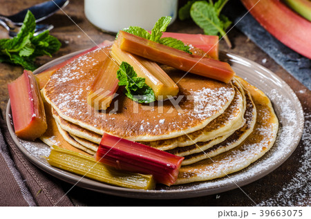 Homemade pancakes with roasted rhubarb