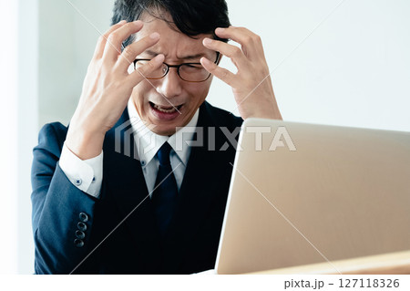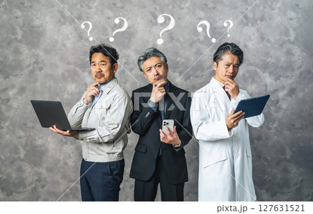 デジタルデバイスを持って悩む様々な職業のミドルエイジ男性グループ