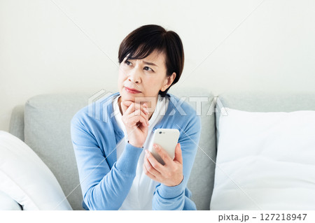 ソファに座ってスマホを人差し指で操作する70代の女性