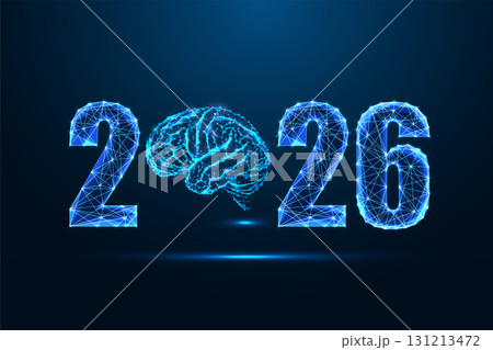 2026 with glowing brain symbol in digital low poly style vector illustration for AI and innovation
