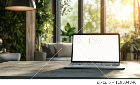 3D rendering of a laptop with a blank white screen on a table in a modern home office interior, with a blurred conference room and greenery outside the window in the background