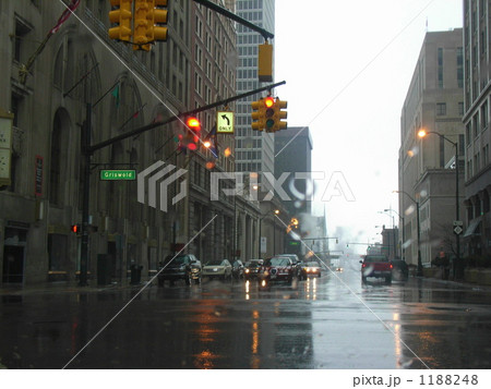 デトロイトの雨のダウンタウンにて