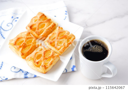 美味しそうなリンゴのデニッシュとコーヒーでおやつの時間