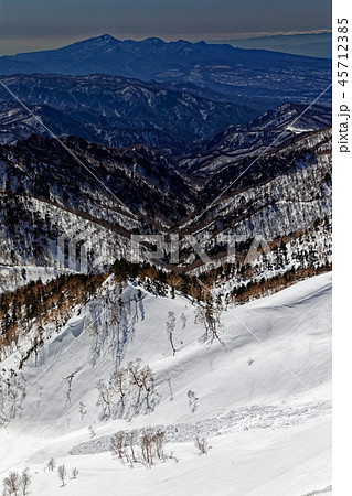白馬岩岳スノーフィールドから杓子沢と雪崩の跡を望む