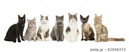 Group of various breeds of cats sitting in a row