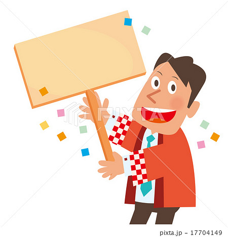 大売り出しのぼりを持つ赤いはっぴの男性店員