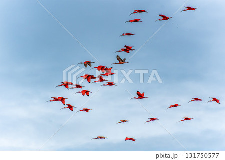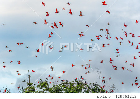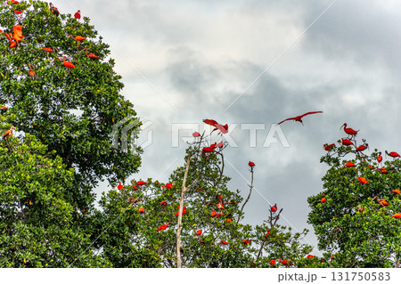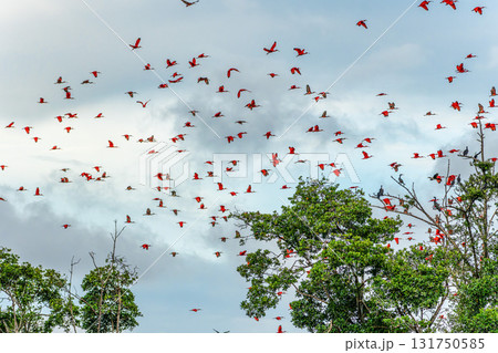 Scarlet ibis flying back home to their sleeping place, Revoada dos guaras on the Delta of the Parnaiba River in Brazil
