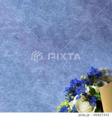 ブルー&ホワイトの花束、洋風和紙の藍色背景