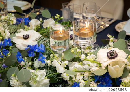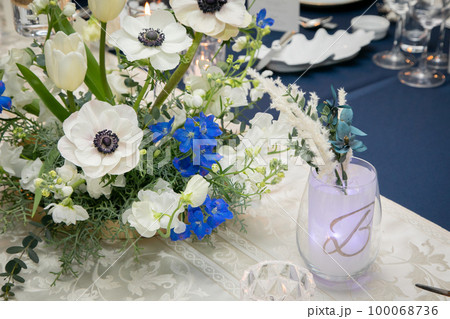 披露宴会場のテーブル装花 サムスィングブルー 春の結婚式
