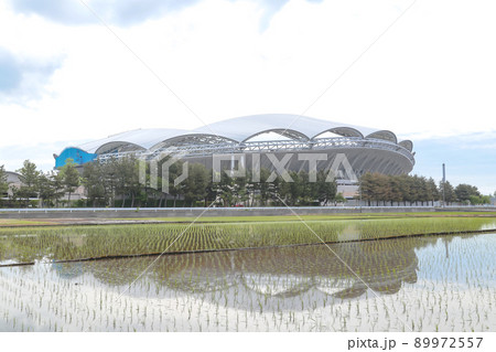 田んぼの水面に映るビッグスワンスタジアム