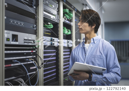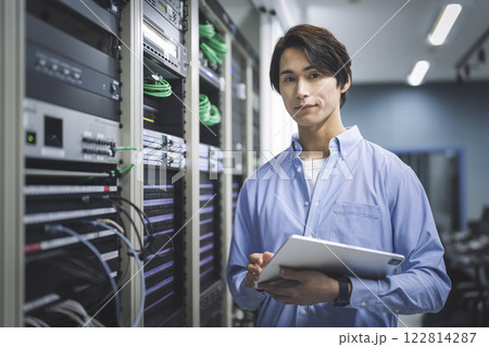サーバールームで作業をするエンジニア イメージ カメラ目線のポートレート