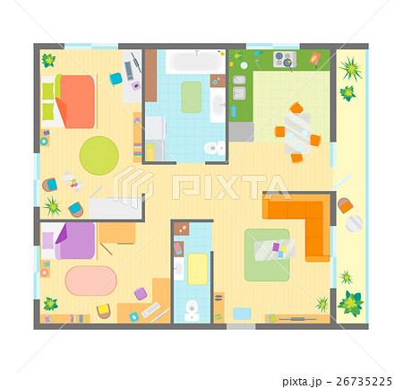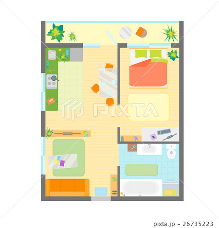 Interior plan. Detailed apartment furniture overhead top view. Apartment room plan. Architectural color floor plan with one bedroom. Studio apartment. Hand drawn top view