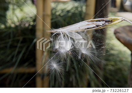 裂けたサヤから出て綿毛が広がるオキシペタラムの種/瑠璃唐綿