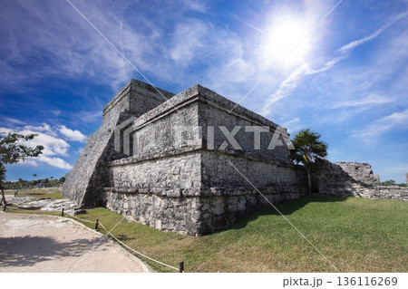 Ruins of ancient Tulum. Architecture of ancient maya. View with temple. Travel photo. Wallpaper or background. Quintana roo. Yucatan.