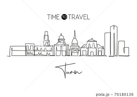 Single continuous line drawing of Turin city skyline, Italy. Famous skyscraper landscape postcard. World travel home wall decor poster print concept. Modern one line draw design vector illustration