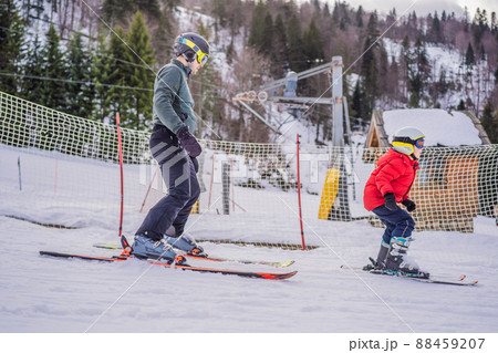 Boy learning to ski, training and listening to his ski instructor on the slope in winter
