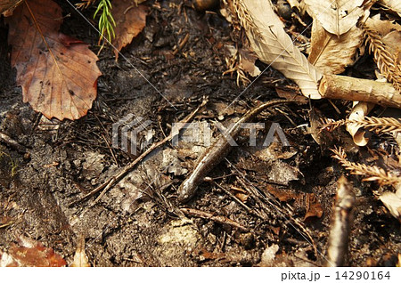 落ち葉の上を歩くトウキョウサンショウウオ幼体