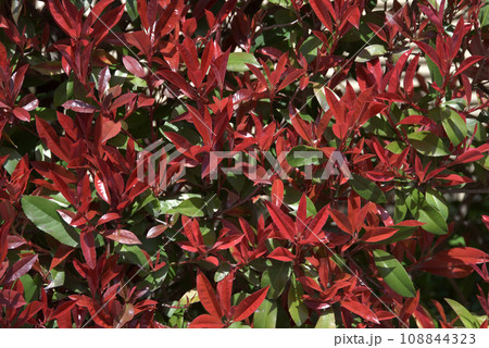 春の陽射しを浴びて輝く赤い葉のオオバベニガシワ