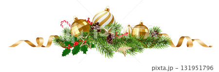 Colorful Christmas tree branches decorated with holiday ornaments and sparkling balls isolated on white background.