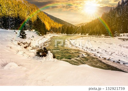 frozen mountain river among spruce forest at sunset. snow on the ground in evening light. countryside valley in winter. storytelling image under the rainbow