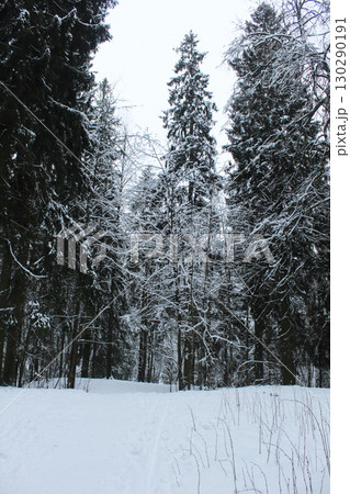 Tall spruces, pines in the snowy winter in the forest. Preparing for Christmas