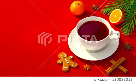 Christmas Hot Mulled wine in white mug with cinnamon, anise and orange on red background. Traditional Drink on winter holiday. Copy space