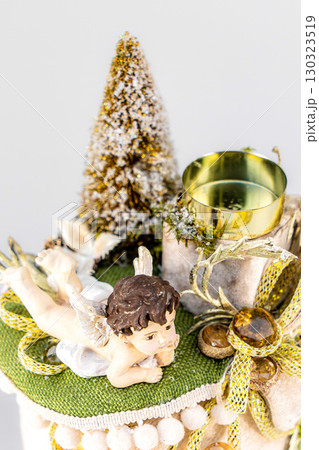 Christmas table composition. Beautiful decoration. Christmas trees, candles, stars, lights and elegant accessories. Merry Christmas and Happy Holidays, Template.