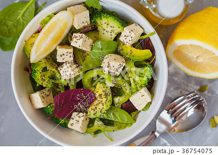 Healthy green salad with broccoli, tofu, avocado