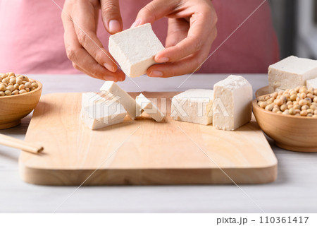 Organic tofu with hand prepare for cooking, Vegan food ingredient in Asian cuisine, Plant based diet