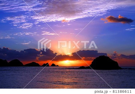 沖縄 マジックアワーの美しい色に染まる海岸