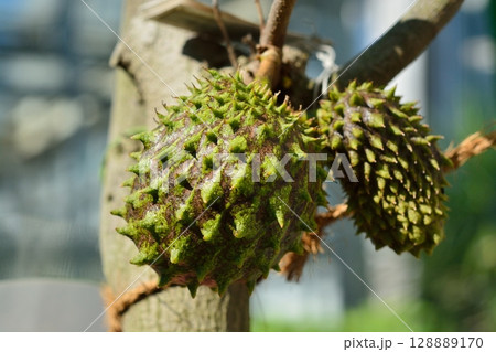 植物園の温室に緑の実のトゲバンレイシの樹の幹のある風景