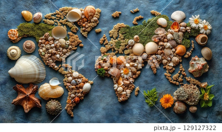 Creative sea style world map showcasing various shells and marine life elements arranged artistically across land masses. Vibrant colors highlight the continents and oceans uniquely
