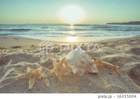 shell on the beach at sunset time.